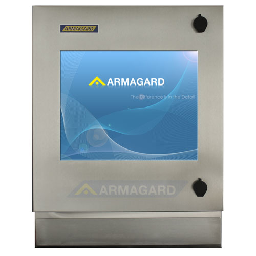 Impermeable a IP65 y fabricado en acero inoxidable grado alimentario, el armario pantalla táctil lavable compacta SENC-350 está diseñado para proteger ordenadores tipo Thin Client en áreas de limpieza o lavado.