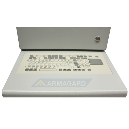 El armario de la serie 300 está equipado con un teclado de membrana y ratón y puede montarse en la pared o colocarse sobre un soporte opcional.